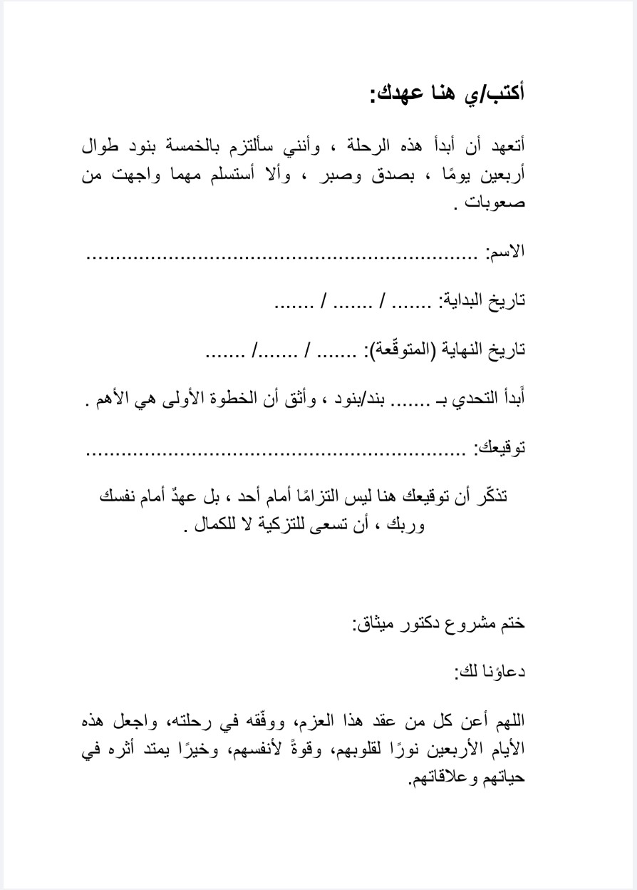 فكرة التحدي تقوم على الالتزام الصادق لمدة أربعين يومًا بقواعد واضحة، تُعيد تشكيل طريقة تعاملك مع نفسك ومع من حولك. وهذه المفكّرة جاءت لتكون رفيقك اليومي في هذه الرحلة؛ تذكّرك بما عاهدت نفسك عليه، وتتابع معك التزامك خطوة بخطوة، حتى تصل إلى النهاية بوعي حقيقي لا بمجرد حماس مؤقت.